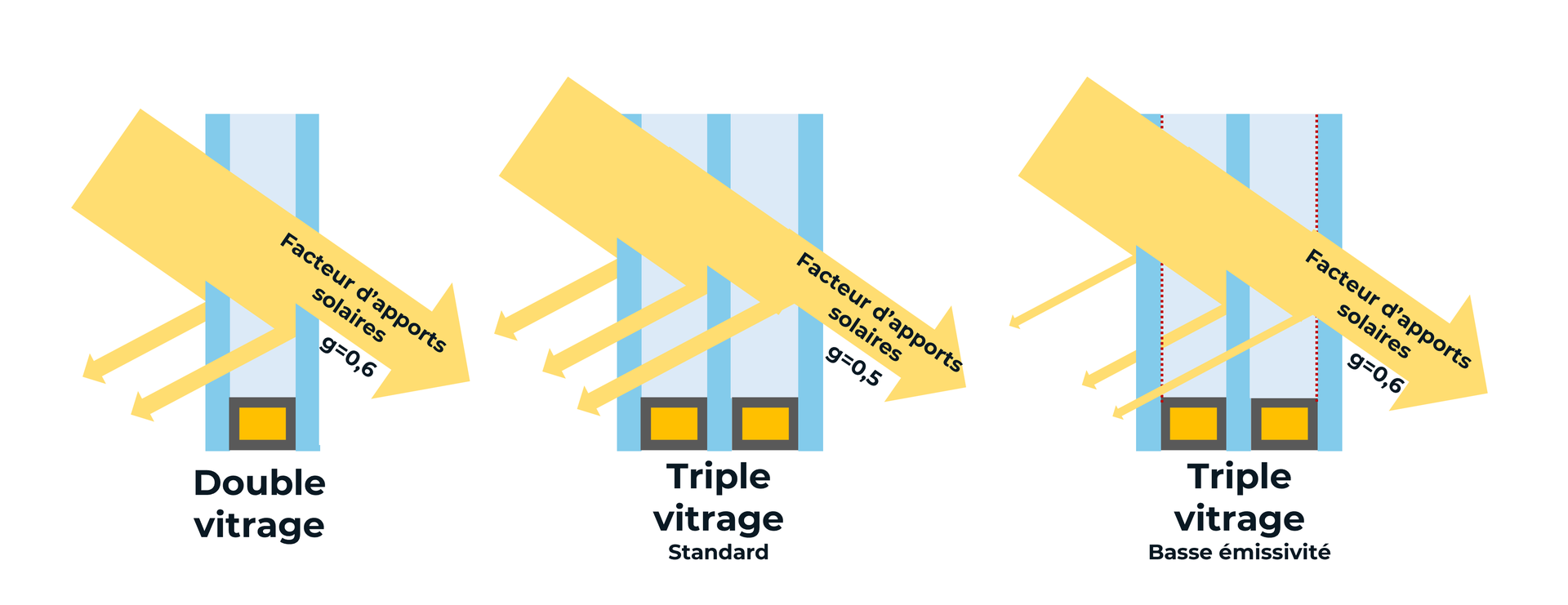 L'objectif est de s'équiper de menuiserie possédant un bon facteur d'apport solaire (grand facteur g) mais aussi, une forte capacité isolante (faible Uw), de manière à laisser entrer un maximum d'énergie par rayonnement et de la conserver au maximum sans qu'elle s'échappe par transmission à travers les menuiseries.