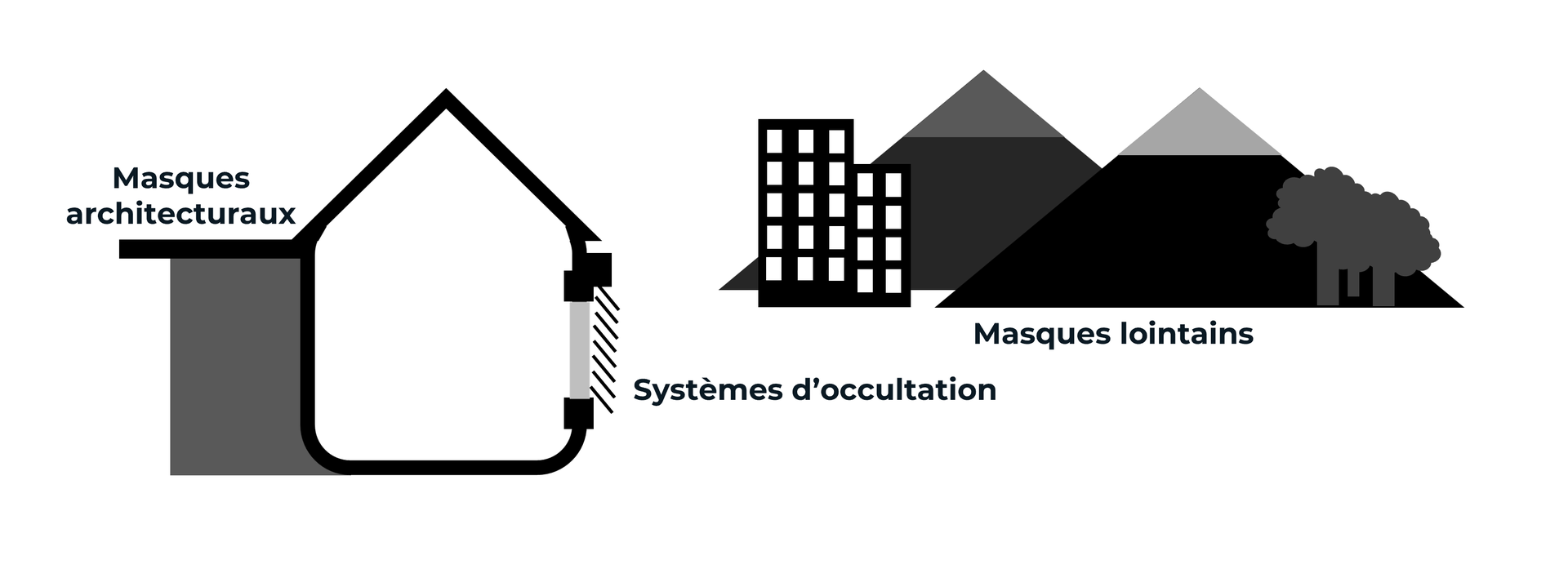 En été, on va chercher à limiter ces apports solaires, pour éviter la montée en température du bâtiment. Pour cela, l'étude thermique tient compte des effets d'ombrages dus aux masques architecturaux, aux masques lointains et aux systèmes d'occultations.