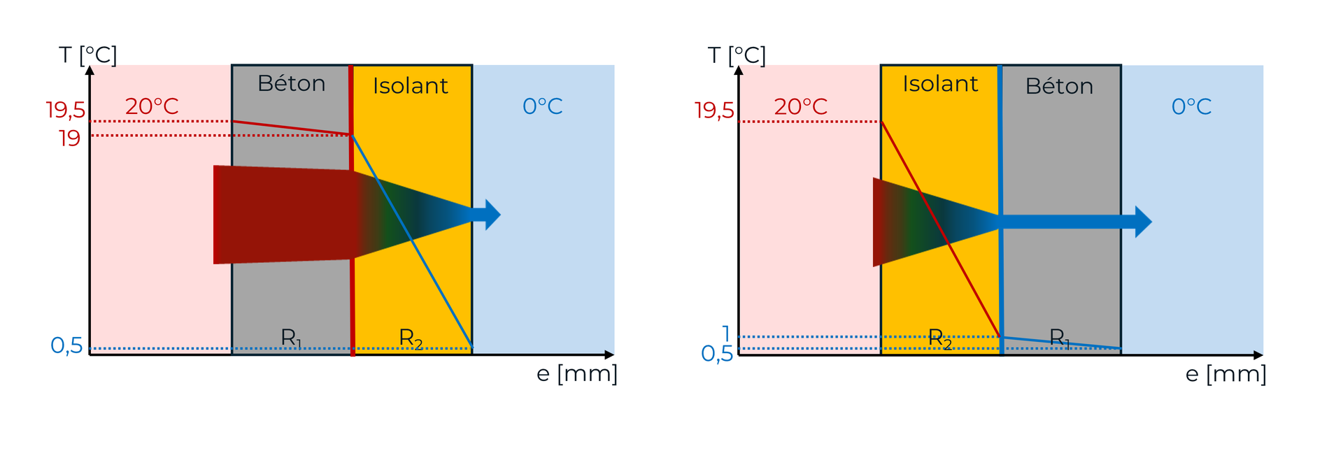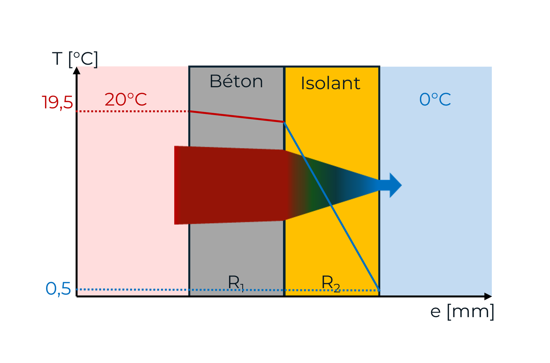 A l'inverse, l'isolant a une forte résistance, un faible flux de chaleur le traverse. Sa paroi intérieure est chaude et sa paroi extérieure est froide